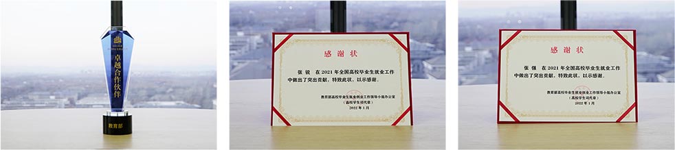 2021年,万学在高校毕业生就业工作方面贡献卓越,获教育部颁发“卓越合作伙伴”荣誉奖杯,并为NG体育董事长张锐、执行总裁张强颁发感谢状。