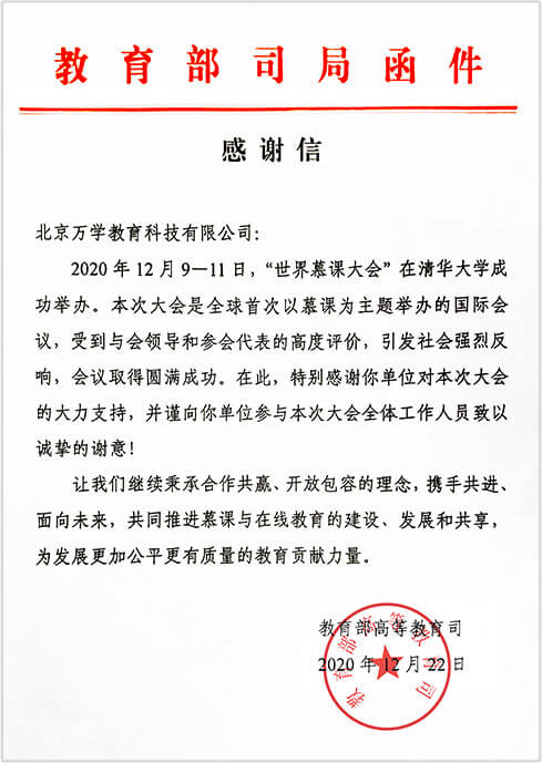 • 万学由于在配合教育部世界慕课大会的工作中做出了重要贡献,获得教育部重磅感谢信。