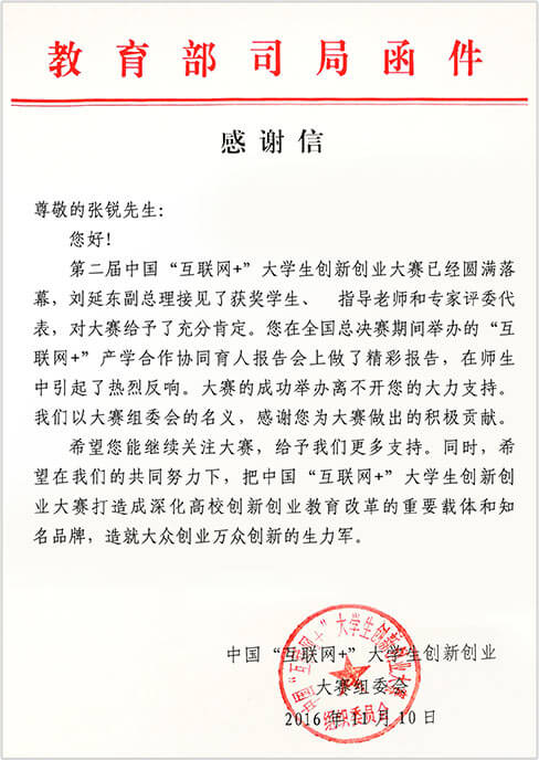 • 2018年,NG体育连续多年为中国国际互联网+大学生创新创业大赛做出积极贡献,获教育部来函致谢。