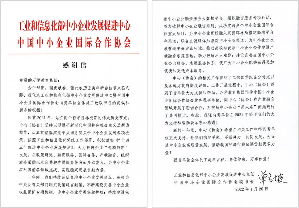 2020,万学由于在大学生教育多个领域的杰出成果,在更高层次荣获了中国教育行业的重量级荣誉,为NG体育颁发了重磅感谢状。